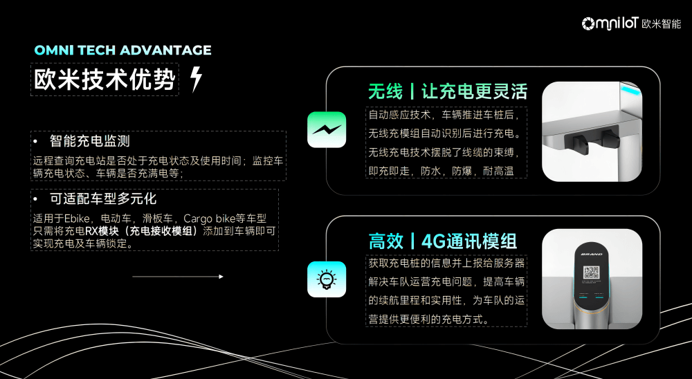 :歐米智能無線充電樁采用磁共振無線充電技術(shù),實現(xiàn)車輛智能無線充電系統(tǒng),避免來回換電、集中充電等帶來的安全隱患,歐米無線充電樁充滿自動斷電、溫度檢測功能能有效做到充電安全管控及危險防范 成本:有效避免目前平臺運營,增加配置30%換電電池需求,平均每臺車降低600-1000元的固定成本 管理:目前平臺運營,集中換點,每天需要大量的來回調(diào) 度,增加成本的同時影響用戶騎行。采用無線充電樁,減少來回調(diào)度任務(wù),同時采用線上任務(wù)模式,讓用戶自主還車到充電樁,獲得額外 獎勵等激勵形式